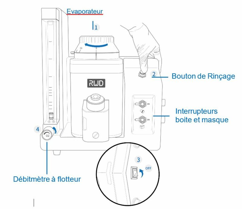 -2 interrupteurs en face avant : pour la chambre d’induction et pour le maintien au masque