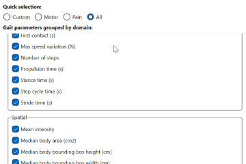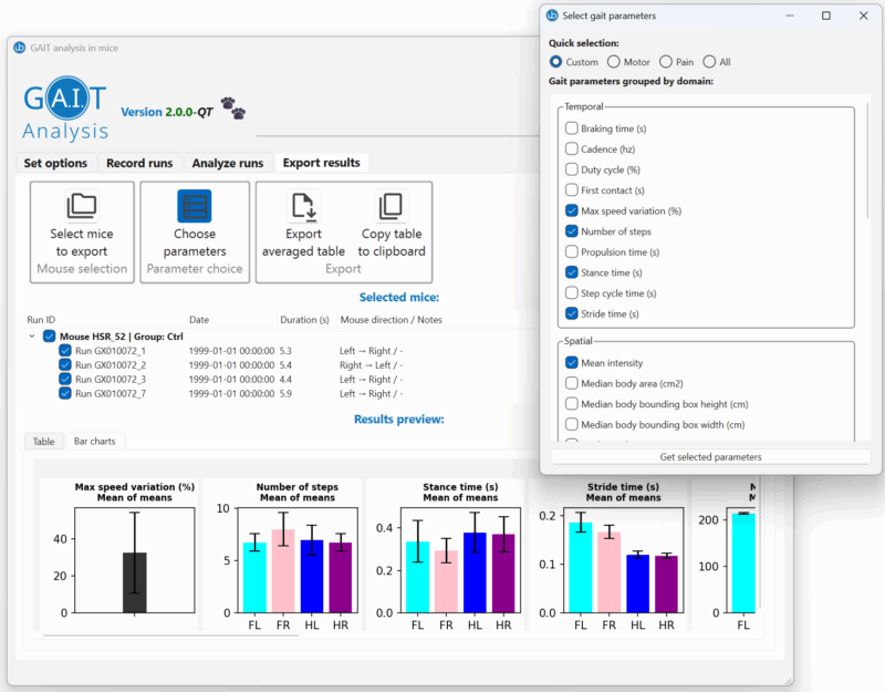 Ces outils offrent des évaluations avec de nombreux paramètres dérivés à haute résolution, telles que la durée de la phase d’appui, la variabilité de la foulée et la coordination inter-membres, enregistrés dans des conditions de marche spontanées. Le principal défi actuel de l’analyse automatisée de la marche est l’identification correcte de chacune des  pattes afin de calculer tous les paramètres  d’intérêt automatiquement et sans intervention de l’opérateur.