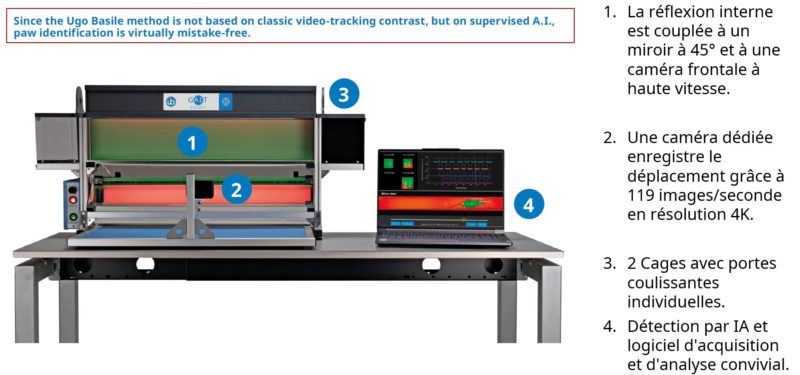 Le Système GA.I.T de Ugo Basile utilise un algorithme d’intelligence artificielle « supervisée » pour discriminer  et identifier la position de chaque patte et chaque partie du corps à chaque image, au lieu des techniques d’imagerie traditionnelle et mal adaptées pour cette application.